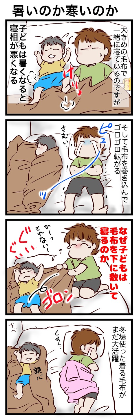 ちょっと寒くなって毛布を引っ張ろうにも、上に息子が乗っているので
