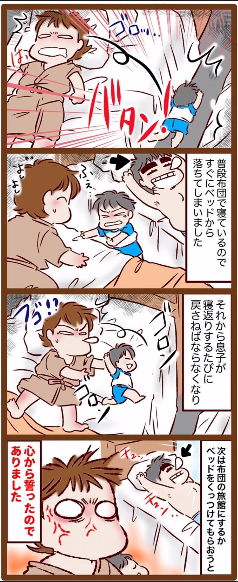 私もできるだけ壁によって、息子を真ん中に寝かせたのですが、大胆な寝返りで