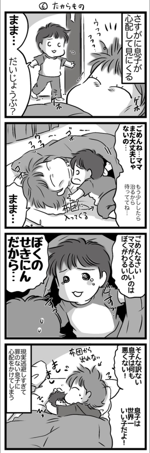 「ママが寝てばかりいる」=「僕と離れたい」=「僕に怒っている」=「僕が悪い事をした」と思ったみたいです💦