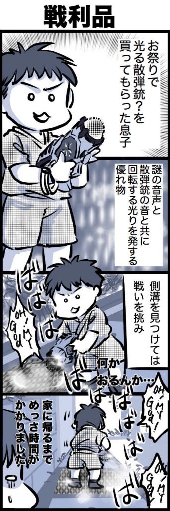 お祭り思い出3。見えない敵と戦う息子。(四コマ漫画)