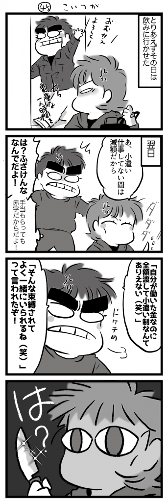 「自分が働いた金全部取られて”小遣い”とか訳わからねえwそんな束縛された生活で辛くないの?wwよくやっていけるねww」的な事を言われたらしく、私に伝えてきました。