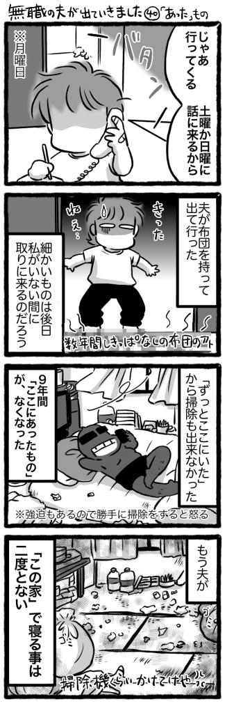 そうして「布団=寝る場所=帰る場所」を持って、夫は出ていきました。「=もうここには戻らない」
